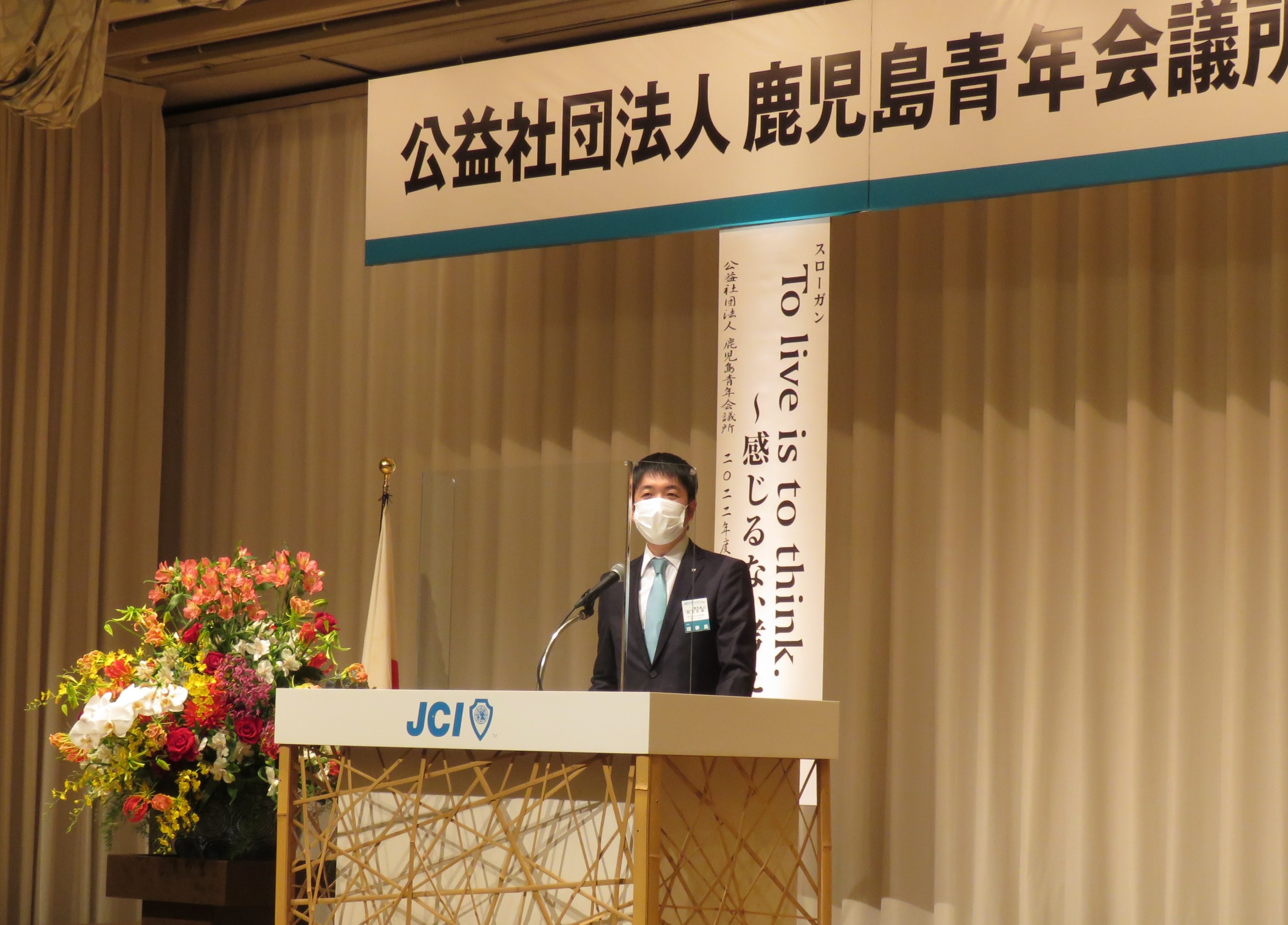 はじめに、理事長 前田忠倫君より所信が述べられ、スローガン「To live is to think. ~感じるな、考えろ~」を発表。感染症対策など行動の制限がある中でもこれまでの経験を活かし社会課題と向き合うとともに「常に考えることを意識して鹿児島を発展させていきたい」と今年一年にかける思いを表明いたしました。